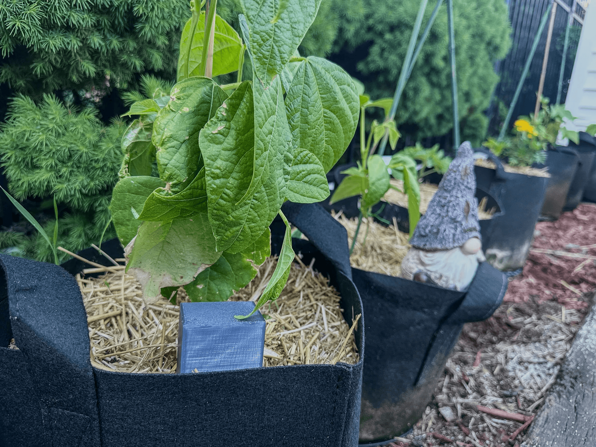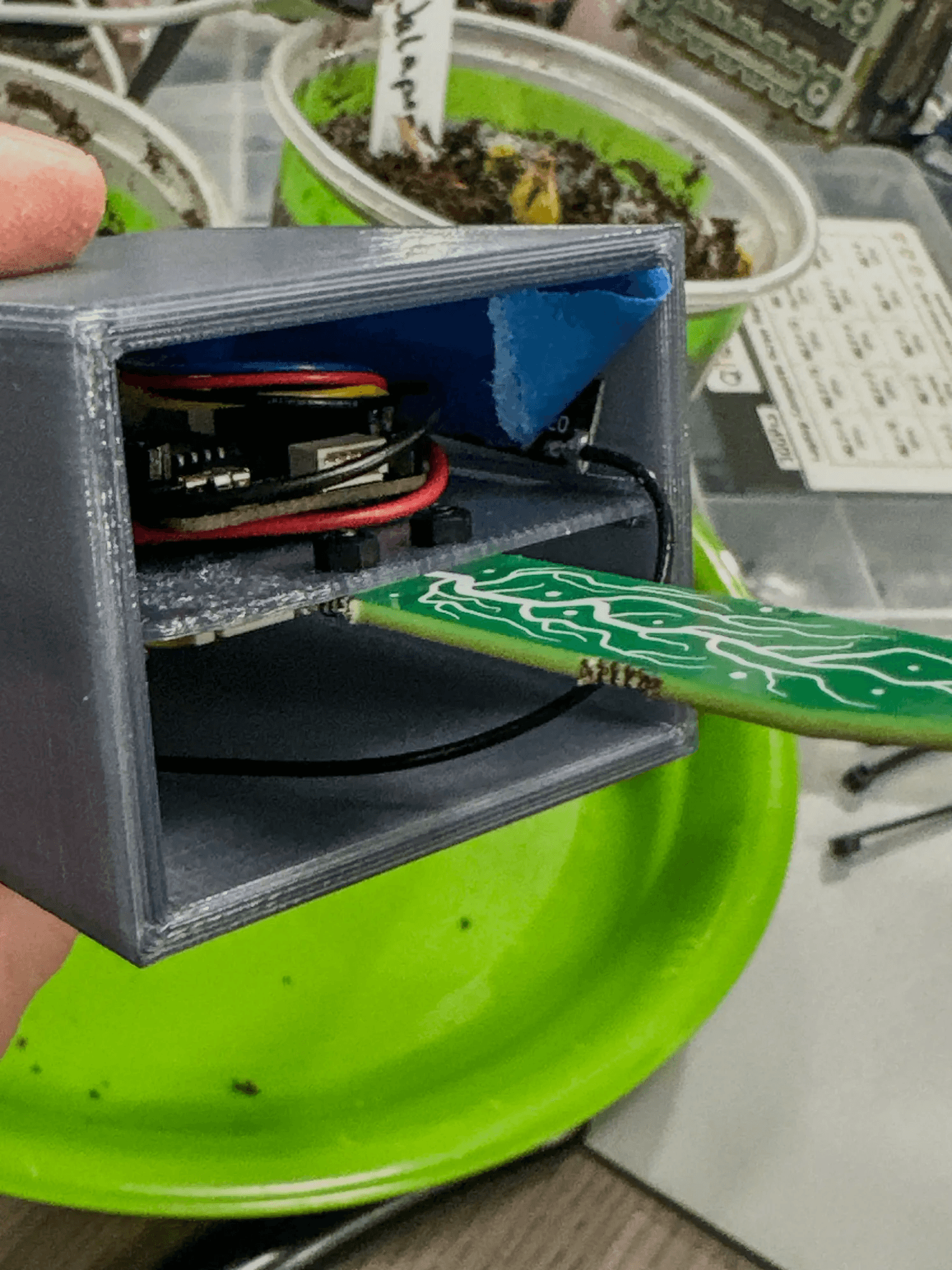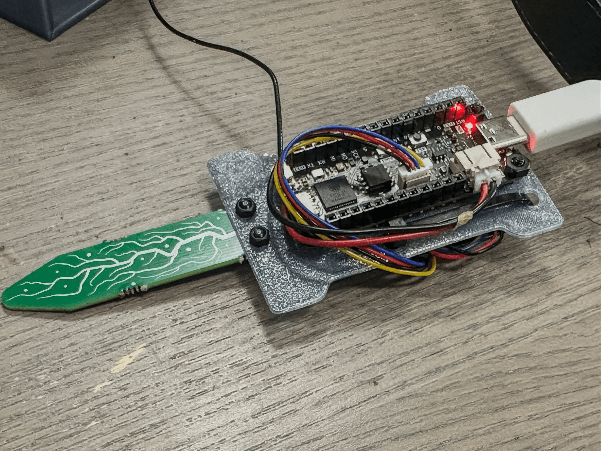 The hardware stack includes an Adafruit Capacitive Soil Moisture Sensor, an Unexpected Maker Feather S3 microcontroller, and a custom 3D-printed enclosure to house the electronics. Together, these components collect and transmit reliable soil and temperature data while keeping the setup neat and protected.