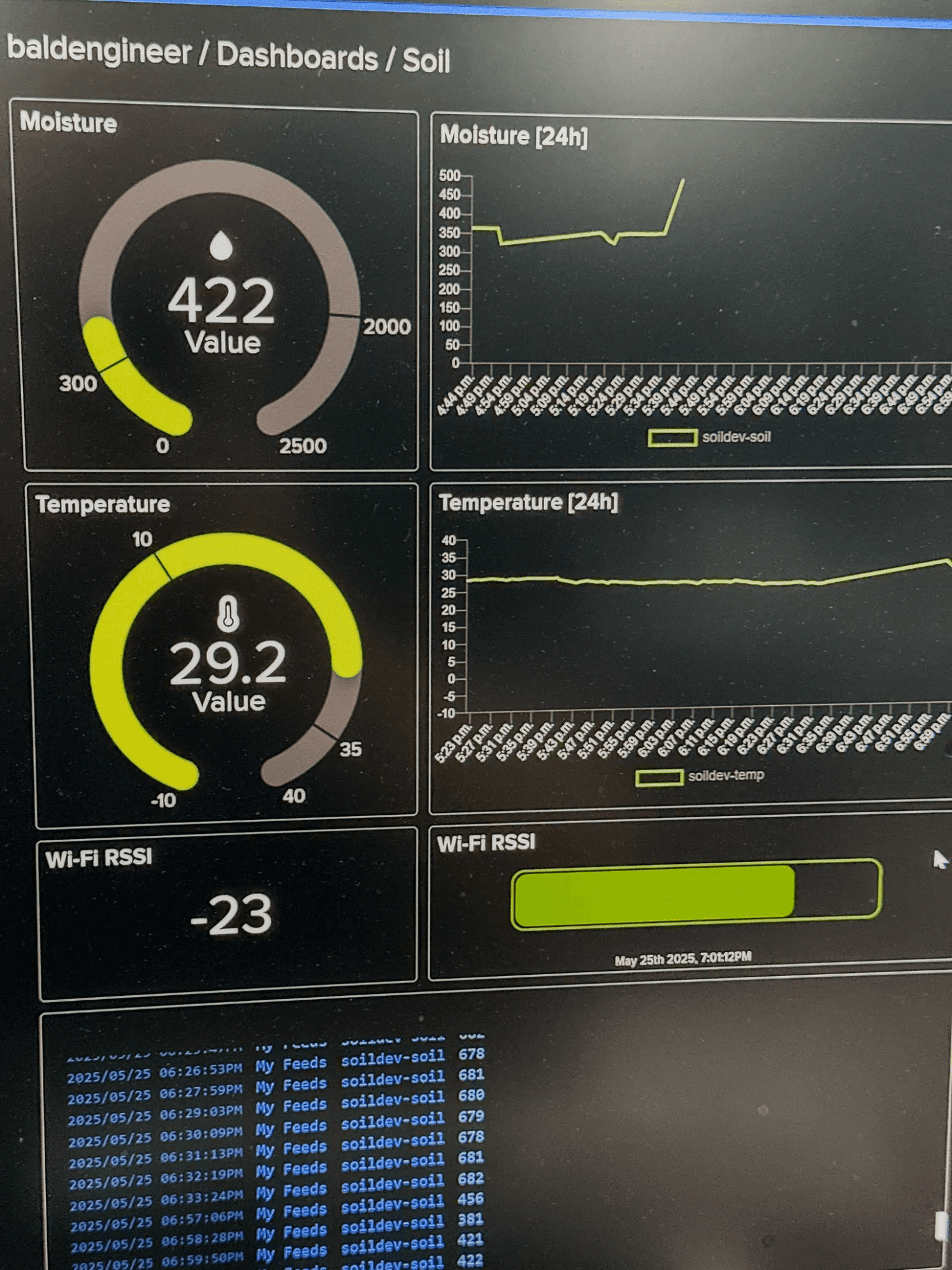 Firmware is written in CircuitPython, and sensor data is sent to the Adafruit IO cloud platform for real-time visualization. Users can view soil moisture levels, temperature trends, and Wi-Fi signal strength through a clean dashboard interface. The system makes it easy to monitor multiple plants and quickly detect when adjustments are needed.